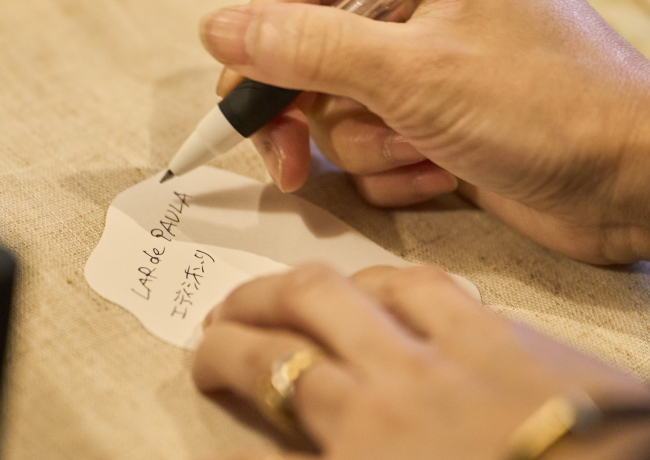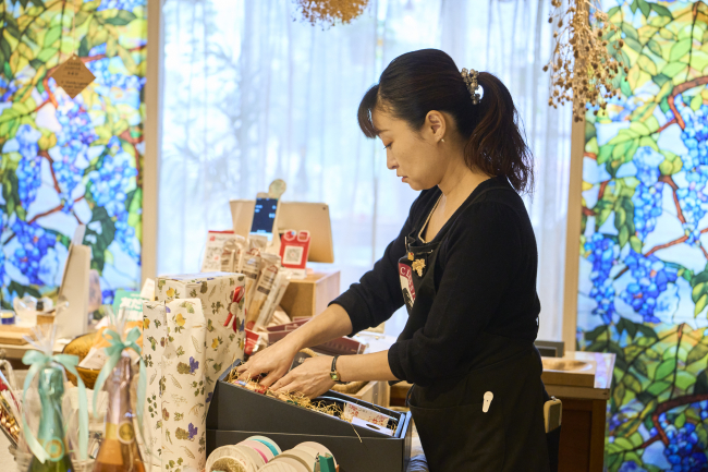藤丸で接客の経験を積んだ志織さんだけに、ラッピングへの思いは人一倍。「百貨店ロゴが付いた包装紙は、高級感や安心感を与えます。自分の店でもそんな1枚を用意しくて」。自らイラストを描き、利夫さんと親交があるデザイナーにアレンジを依頼。フォーマル感があり、温もりも感じる包装紙を目指した。