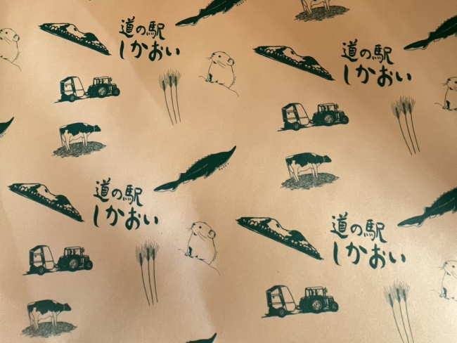 2017年、絵画を趣味にしていた鹿追町の農業実習生が、縁あって包装紙のデザインを担当。同町の名産であるチョウザメのほか、ナキウサギ、牛、牧草ロールなどがにぎやかに散りばめられている。