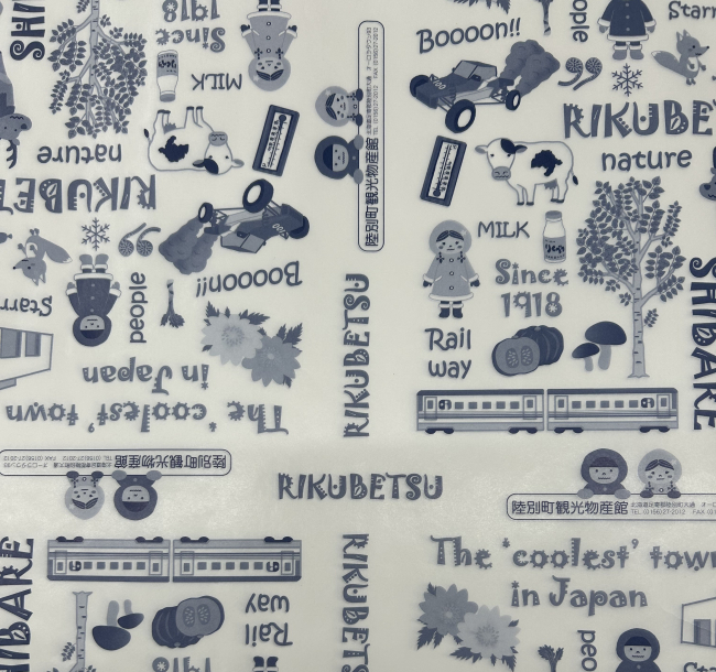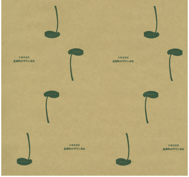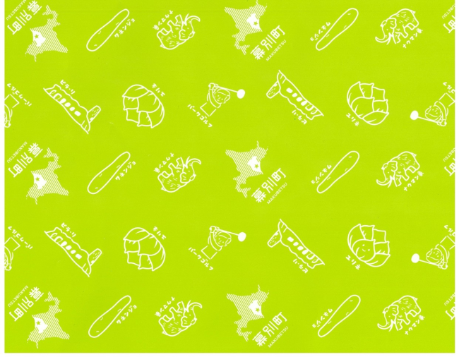 幕別町観光物産協会会員のみが使用できる包装紙。パークゴルフやユリ根のイラストが同町らしさを演出する。同じ絵柄のエコバックは、同町プロモーションのイベントなどで登場する希少品。