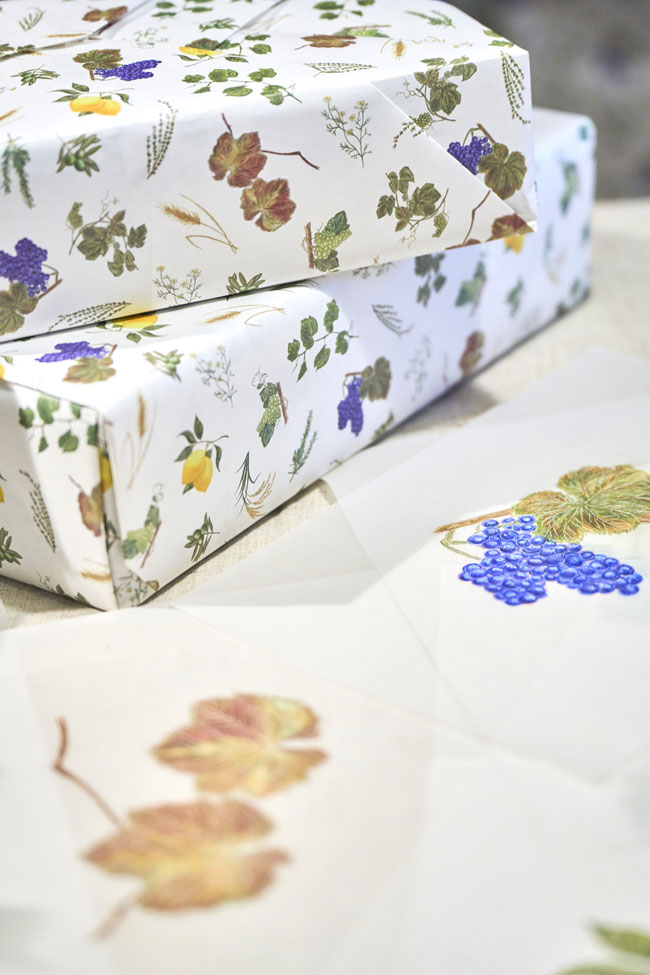 オリジナルの包装紙は、店の名刺代わり。そのデザインを目にするだけで、店内の様子が自然と思い浮かぶ。帯広市内にある小さなワインショップ・鈴木商店の包装紙も、店のコンセプトを伝える大切な存在。色鉛筆で描かれたブドウやレモンのイラストが印象的で、洗練されたショップの雰囲気にぴったりだ。