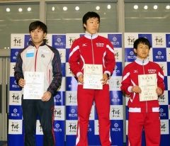 男子500メートル1部優勝準優勝の村上右磨(北翔大-帯工高出)、優勝の長谷川翼(日大-白樺学園高出)、3位の後藤卓也(日大-帯農高出)=左から。十勝勢が表彰台を独占した
