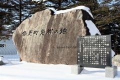 宝来地区から十勝川温泉に向かう道道77号沿いの北側、本照寺(下士幌北2線)の境内に「音更町発祥の地碑」と「大川宇八郎顕彰碑」が並んで建っている。