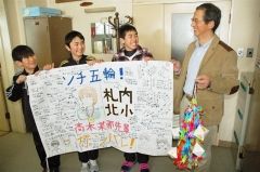 【幕別】ソチ五輪(ロシア)スピードスケートの女子1500メートルと団体追い抜きの日本代表で、町出身の高木菜那選手(日本電産サンキョー)を応援しようと、母校の札内北小学校と札内中学校の児童・生徒らが開幕前日の6日、それぞれ仕上げた寄せ書きなどを高木選手の家族に手渡した。