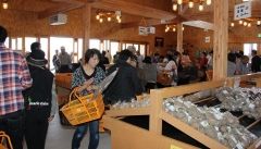 大津漁協青年部提供による養殖カキの販売(1個100円)や1袋100円のメークイン詰め放題などが来場者を喜ばせた。