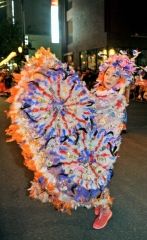 ○…個人優勝の山西さんは、チョウをイメージしたきらびやかな衣装で観客を魅了した。躍動感あふれる踊りと、1カ月かけて作った自前の衣装が審査員に評価され、出場36人の頂点に。