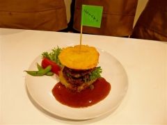 「いももちバーガー」は、十勝産の中身が黄色いジャガイモ「インカのめざめ」で作ったいももちをバンズに見立て、ハンバーグとレタス、トマトを挟んだ。ハンバーグの合い挽き肉に幕別町の放牧豚「どろぶた」を使用し、味の決め手となるトマトピューレの手造りソースを含め、調味料の一部を除いて十勝産にこだわった。