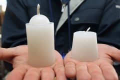 昨年のろうそく(左)に比べ、バランスの良い明るさにしようと芯を細くした今年のろうそく
