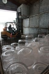 農業用コンテナに入れられたアイスキャンドル。イベント当日まで倉庫の中で保管される