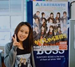 小森さんは砂川市出身で、広域通信制の同校の札幌サテライトキャンパス・声優コースに2012年に入学した。本校でのスクーリング(面接指導)の授業で書道を指導していた安藤さんに、「ここはどう書いたらいいですか」と尋ねてきたのが最初の出会いだった。その後、廊下で会った際に「私、絶対に女優になります」と目を輝かせる小森さんに、安藤さんも「実現したら、十勝に後援会をつくって応援するよ」と応え、小森さんと、小森さん自身が最前列の中央に写っている同校のPRポスターを撮影した。