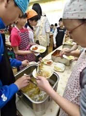 午前7時に調理を開始。職員は約100人体制で、それぞれの担当に分かれて炊飯などの作業を行った。新たに炊飯やあえ物室を整備することで、混ぜご飯やサラダなどの調理も可能になった。