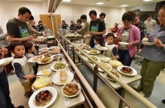 今月は町ふれあいプラザで27日午後6時半から開かれ、東京や広島などから移住した家族ら約20人が参加。アキアジやワカサギといった魚料理、誕生日を迎えた参加者を祝うホールケーキなど15品近く並び、自己紹介や互いに近況報告しながら交流を深め合った。