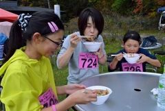 完走後、ランナーには本別名物「ジャンボ義経鍋」(豚汁)が振る舞われた。(鈴木裕之)