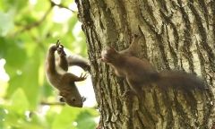 おびひろ動物園(柚原和敏園長)内にあるカシワの大木にエゾリスの親子がすみ着き、母リスに見守られながら子リスたちがすくすくと育っている。