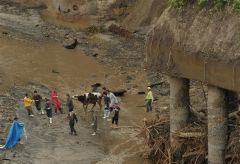 水が引いた川を渡り、牛を助け出す関係者。右手前は芽室川の増水で土が削り取られた橋脚
