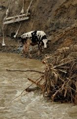 足元まで迫る川の水を心配そうな表情で見つめる牛