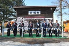 幸福駅で、友好駅協定締結を記念してテープカットを行う、米沢帯広市長(右から4人目)。同5人目が小倉豊十勝日台親善協会副会長(25日午前10時20分ごろ、金野和彦撮影)