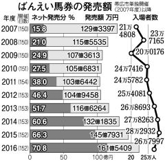 帯広市が主催するばんえい競馬の2016年度馬券発売額は161億5409万3000円(前年度比10・8%増)に達し、07年度の市単独開催後最高額となった。インターネット(IN)発売は初めて全体の7割に上り、1日当たりの発売額も初の1億円超え。一方で収益性の低下が懸念され、実質黒字額は前年度の2億円を下回る見通しだ。