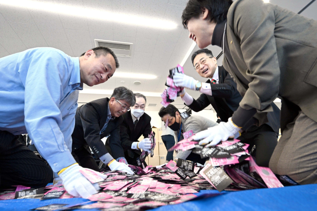 1等の現金5万円は100本、当たりくじを均等に仕分け 年末大売出し