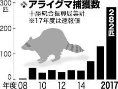 振興局は今年2月、管内の全19市町村が参加する「十勝管内アライグマ対策会議」を立ち上げた。アライグマは北米原産の外来種。繁殖力が強く、全道で生息地域が拡大中だ。道は15年度から、出産・授乳時期で活発に動き回る4~6月を「春期捕獲推進期間」と位置付け、各市町村に捕獲を呼び掛けている。