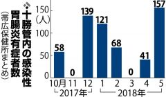 十勝管内でノロウイルスの流行が終息せず、集団感染が相次いでいる。今年5月は保育所などの集団感染が7件、157人となり、5月としては過去5年で最多となった。帯広保健所は「季節柄、食中毒と間違えやすいが、嘔吐(おうと)や下痢などの症状が出たときは、まずノロウイルスを疑って。人が集まる施設や家庭では、手洗いと消毒を徹底してほしい」と注意を呼び掛けている。