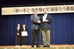 同イベント内では復興支援金の贈呈式も行われ、高堂建設(帯広、高堂匠美社長)と池田高吹奏楽部の牧田部長らが、それぞれ宮坂尚市朗厚真町長に支援金を手渡した。
