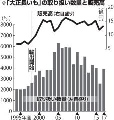 JA帯広大正の大正長いもは、海外への輸出に合わせて生産を拡大した。取扱量は当初の年間2000トン台から徐々に増加し、2005年には6000トンを超えた。17年は3896トンを生産。このうち、全体の35%に当たる1369トンを輸出している。