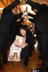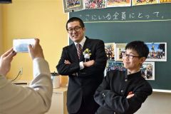 最後のホームルームを終え、担任の石塚英一教諭とキメポーズ(芽室小・澤村真理子撮影)