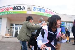 87年間ありがとう-。在校生がつくったアーチをくぐって校舎を巣立った卒業生(士幌新田小・藤島諒司撮影)