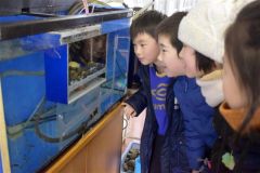 水槽内の環境を整えながら、児童の質問にも優しく答える。3月中旬からはおなかに付いていた「さいのう」もなくなり、餌を与えられると聞くと、その場にいた子どもたちは喜んだ。
