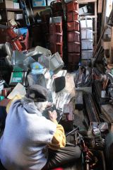 作業は自宅横の小屋で一日1個のペースで作る。製作物の材料や工具などが所狭しと並ぶ。高齢で足腰は弱ったが、目と耳は問題なく、「全くぼけていない」と笑う。