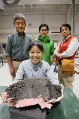 29日に茂川流布川流域で脊椎動物の化石を探そうとサントニアン期(8600万~8300万年前)ごろの地層を調べていたところ、「K/Pg境界」の下流域で、佐藤准教授がしま模様の付いた泥岩を発見した。アンモナイト化石はむかわ町で数多く発見されており、同町で研究する西村学芸員らがアンモナイトと確認、2日間かけて採集した。