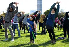 軽い運動の後に牛乳を飲んで健康な体づくりを図るイベント「みるウオーク」が20日、音更町のむつみアメニティパーク(発着点)で開かれた。親子連れら約200人が、ショートコース(約4・5キロ)とロングコース(約9・3キロ)に分かれ、青空の下、心地よい風を受けながらそれぞれのペースでゴールを目指した。コース途中には、赤く染まったモミジやレモン色の鮮やかなイチョウ並木も見られ、晩秋の鮮やかな景観が参加者の目を喜ばせた。