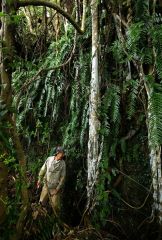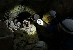 民家から少し離れ、丘陵帯へ分け入ると、ジャングルに目隠しされていた岩場が姿を現す。壁面には焼かれたような黒々とした跡。既にこの一角では子どもを含む3体の遺骨が発見されている。メンバーがねじり鎌で慎重に土をかくと、人骨や手りゅう弾の安全ピン、砲弾片などが次々と見つかる。小さい破片を手に「これは頭蓋骨です」。具志堅さんはため息をついた。