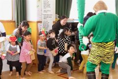 0歳から年長までの全園児と地域の子どもたち約90人が集まった。先生が豆まきの意味について「おなかの中にいる泣き虫やおこりんぼ虫、いじわる虫を持っていってもらおうね」と説明し、手作りの入れ物に豆を入れると、子どもたちも少しずつこわばった表情に。全員で豆まきの歌を歌っていると、赤鬼と青鬼がこん棒を持って突然乱入した。