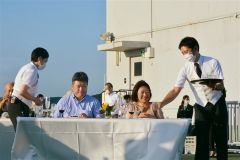 ワイン城の屋上でワインパーティーに臨む乗客ら(28日)