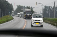 豊頃町に入り、管内の建設業の大型トラックが私たちの後ろについた。車間距離を十分に取り、追い越し可能になっても追い越そうとしない。「こんなことは初めてだ」と同僚記者。ところが、市街地で最高速度が60キロから50キロに変わった直後、追い越し禁止区間にもかかわらず、私たちを追い越した。その後を別の大型トラックが続いた。私たちが最高速度を守って減速したため、後ろの大型トラックのプレッシャーに耐えかねたと思われる。