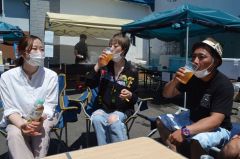 ○大樹町内では26日午前11時から「ビアガーデン」が催され、来場者は乾いたのどを冷たいビールで潤していた。