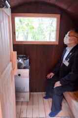 26日午前10時から報道機関に公開され、林会長が「コロナ禍で利用客に癒やしを与えたかった。サウナ愛好者を含めて客層も広がる」と趣旨を説明。安井美裕町長らも見学に駆け付け、「役目を終えた樽がサウナに生まれ変わってうれしい。町の新たな観光資源になれば」と期待を込めた。