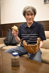 高校時代に使ったグラブを手にする増地さん。持ち帰った甲子園の土は瓶に入れて大事に取っている