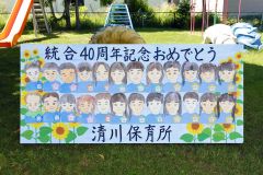 新型コロナウイルス対策で、園児とその保護者、職員の約40人で7月16日に開催。記念事業実行委の中村真大委員長と黒田所長があいさつし、実行委から保育所へ記念品のキッズパーテーションが贈られた。