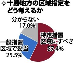 現在の宣言では十勝は札幌などの「特定措置区域」でなく、規制が緩い「一般措置区域」になっている。この区域指定について、「特定措置にすべき」と考える人は57・4%と多数を占めた。理由では「感染者率は道央圏と大きく変わらない」など感染者が多いと考える人が多く、「他地域からの流入が多い」「十勝は安全と思われて観光客などが来たことが、現在の感染増では」と人流増への懸念もあった。