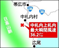 日高山脈沿いの東側に位置する上札内では2008年以降、30メートル以上の最大瞬間風速を計3回記録。これまでの最大は2010年3月21日の34・2メートルだった。10月や12月、3月ごろに風が強い傾向がある。