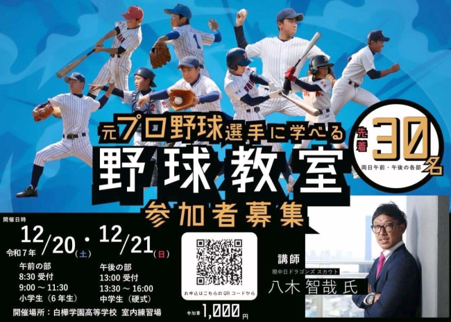 元プロ投手の八木智哉さんを招いた野球教室 受講者募集