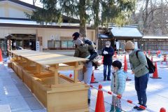 帯廣神社(東3南2、大野清徳宮司)では31日、さい銭箱の増設や、左右に分かれた参拝ルートを整備するなど、昨年に引き続きコロナ感染防止策を講じながら、初詣の参拝者を迎える準備を着々と進めた。