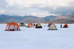 湖上にテント満開 糠平湖のワカサギ釣り解禁