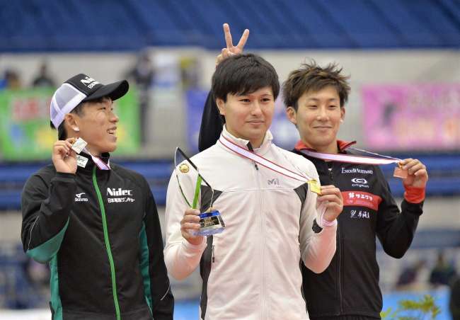全日本距離別選手権大会で男子500メートルを初制覇した村上選手(中央)。左は長谷川翼選手、右は中村駿佑選手(2016年10月21日)