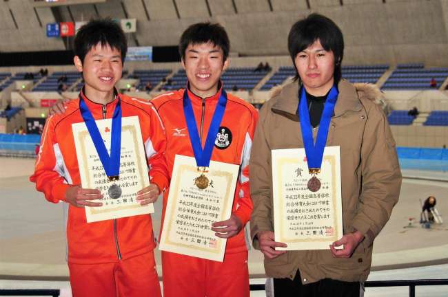 インターハイ男子500メートルで3位に入った帯工3年の村上選手(右)。左から三輪準也選手、長谷川翼選手(2011年1月18日)