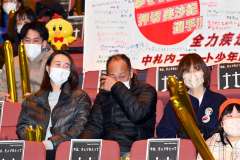 幕別町百年記念ホールでは、オンラインを交えた応援会が開かれた。会場では飯田晴義町長や町内スポーツ団体関係者ら約20人が観戦。オンライン上では押切選手の出身地中札内村の森田匡彦村長、佐藤綾乃選手の出身地釧路管内厚岸町の若狹靖町長ら約90人が声援を送った。