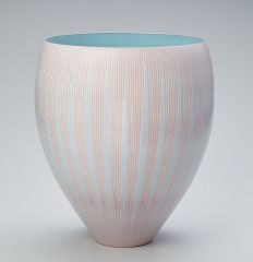 今回入選した作品は三上さんが好きな花で、これまでもテーマにしているハスの花。表面に色の違う化粧泥を重ねて、最後に青磁を塗っている。三上さんは「近年はハスの花をイメージした作品を造っている。評価されてよかった」と話した。