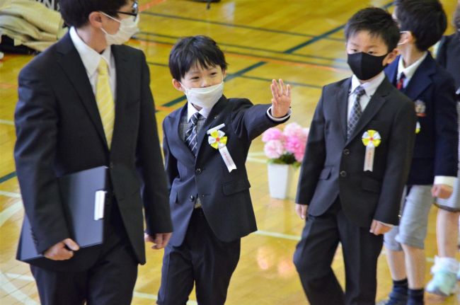 入学式を終え退場する新入生(更別小、本田龍之介撮影)